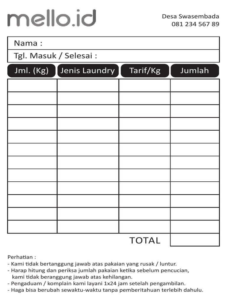 Namun pesan penting yang selalu harus kita pegang dalam dunia usaha adalah jangan pernah berhenti untuk melakukan efisiensi dan efektifitas secara inovatif. Contoh nota laundry penjualan nota toko new design contoh nota laundry sedang menjalani usaha laundry pasti membutuhkan nota sebagai alat bukti pengambilan laundry nantinya sehingga untuk anda yang akan memulai usaha laundry maka ini wajib anda membuatnya adapun contoh. Bagi anda yang masih pakai nota warungan dan berencana beralih menggunakan nota cetak bisa ikuti. Nota berikut memiliki format file pdf dan bisa diedit lewat software desain grafis. Selain berisi informasi branding jasa laundry, biasanya dilengkapi juga dengan catatan khusus tentang ketentuan jika terjadi sesuatu seperti kerusakan, kehilangan dan lain sebagainya.
